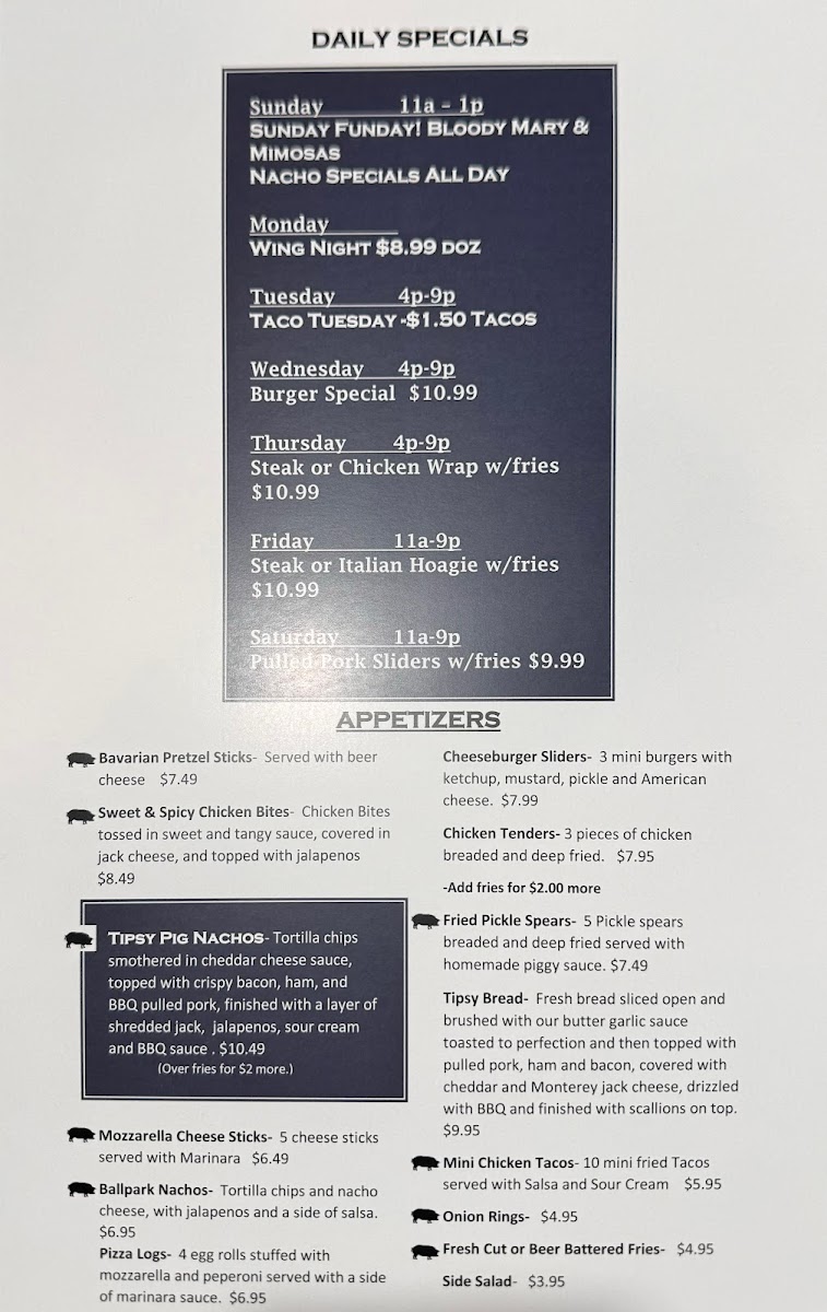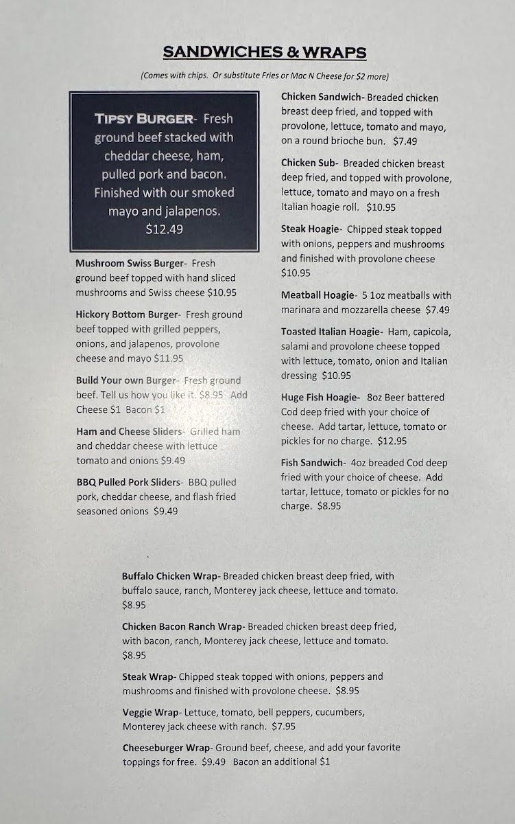 Welcome to Tipsy Pig, a hidden gem nestled in Connellsville, PA, where culinary creativity meets a vibrant atmosphere. Their menu is a delightful fusion that caters to diverse palates, emphasizing comfort food with a twist. Start your journey with Bavarian Pretzel Sticks or the zesty Sweet & Spicy Chicken Bites. Craving something sharable? The Tipsy Pig Nachos topped with BBQ meat are a crowd favorite!